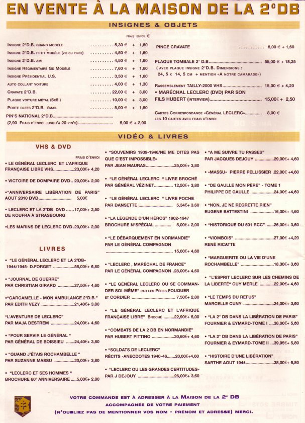 D'autre part, la Maison des Anciens de la 2e D.B. dispose d'une boutique. Vous pouvez procurer des ouvrages, insignes ou encore des D.V.D. Vous trouverez ci-dessous, la liste des produits vendus. Les fonds récoltés sont utilisés pour les manifestations auxquelles participent les Anciens, la diffusion de Caravane.... |